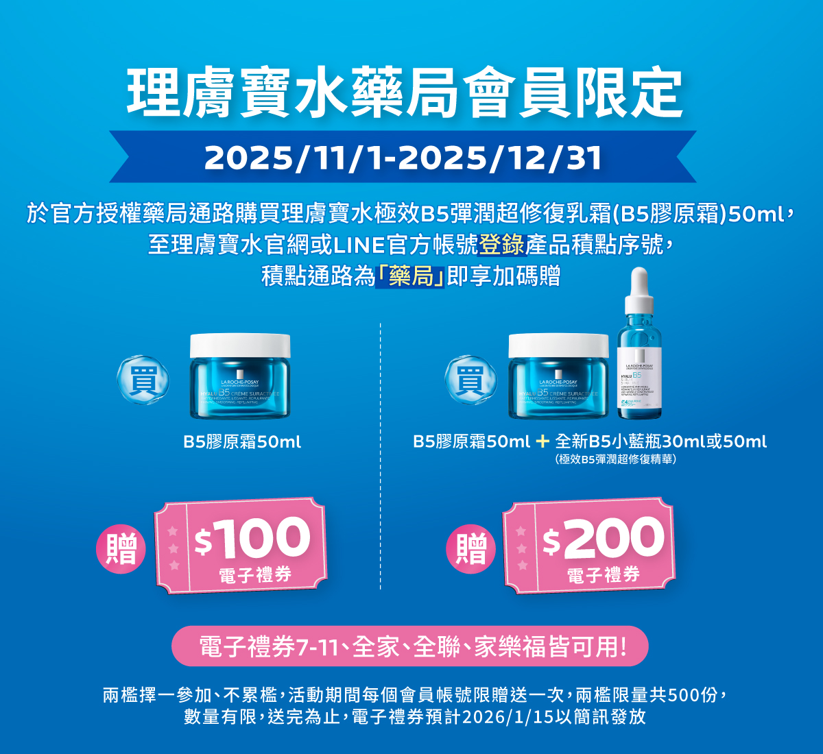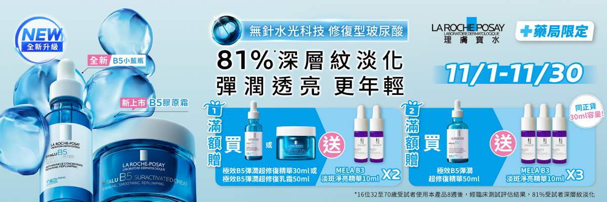 - 活動期間於理膚寶水官方授權實體藥局購買「極效B5彈潤超修復乳霜 (B5膠原霜) 50ml」,回官網或LINE官方帳號登錄產品積點序號,登錄通路為「藥局」,享加碼贈電子禮券100元;活動期間於理膚寶水官方授權實體藥局購買「極效B5彈潤超修復乳霜 (B5膠原霜) 50ml」和「極效B5彈潤超修復精華 (全新B5小藍瓶) 30ml或50ml」 ,回官網或LINE官方帳號登錄產品積點序號,登錄通路為「藥局」,享加碼贈電子禮券200元。