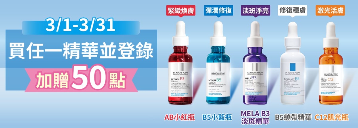 1. 符合本活動指定登錄產品為 : 『 MELA B3淡斑淨亮精華 30ml 、50ml 』、『極效B5彈潤超修復精華 (全新B5小藍瓶) 30ml、50ml 』、『 B5彈潤修復多效撫紋眼部精華 15ml 』、『 C12肌光活膚精華 (C12肌光瓶) 30ml』、 『 A醇緊緻抗痕精華 (AB小紅瓶) 30ml』、『多容安舒緩保濕修護精華 30ml』、 『 B5瞬效全面修復精華 30ml』、 『極效三重酸煥膚精華(#三酸煥膚瓶)30ml』、 『B5彈潤修復超導安瓶 15ml』任一支,於活動時間內完成購買與登錄集點,方符合加碼贈50點會員點數,贈點最晚隔日匯入您的會員帳號。