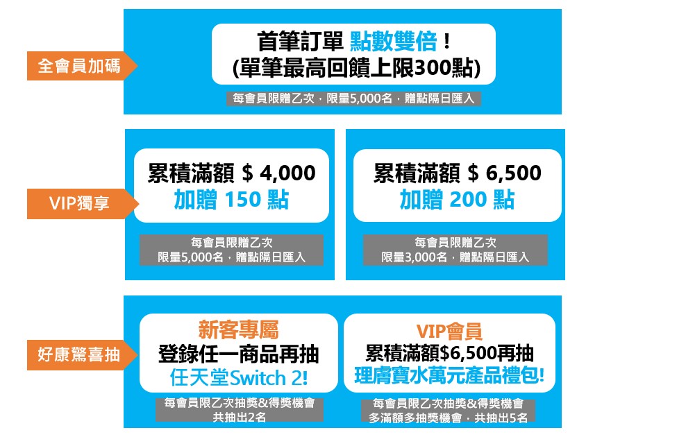 (4) 活動內首筆線上通路積點訂單 與 累積滿額訂單 將以系統判定為準,符合贈點/抽獎資格者,積點完成當下跳pop-up顯示視窗,活動贈點隔日匯入您會員帳號,將依登錄產品時間先後順序排列,數量有限贈完為止。