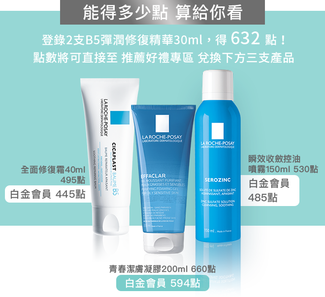 *活動期間降為藍卡:如,3/4為白金卡會員並登錄 B5彈潤修復精華,此支產品具有雙倍點數贈送資格;若4/1降為藍卡身份,再登錄B5彈潤修復精華,此支並不算雙倍點數。理膚寶水保有此活動隨時終止與修改權利。