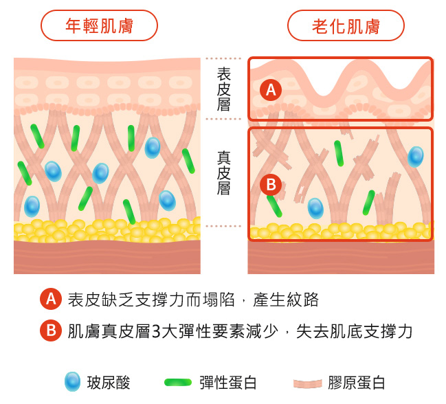 真皮層內的玻尿酸、彈性蛋白、膠原蛋白是肌膚底層的三大彈力要素;隨著肌膚的老化,彈性要素逐漸流失減少,造成表皮塌陷、失去彈性,並產生洩露年紀的皺紋!
