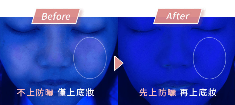 從紫外燈下觀察,顏色較深處為防曬作用區域照片顯示未在妝前上防曬,防護力仍不足!